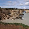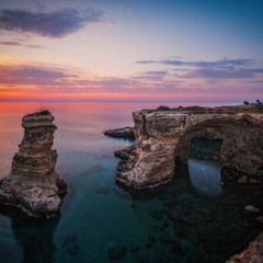 Італія, Апулія. Регіон Саленто, провінція Лечче, скелі Сант Андреа. "Арка закоханих" на світанку, що була зруйнована штормом 14 лютого, тобто два тижні тому. |