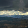 Між чорною хмарою з дощем і рудим карпаттям виникла шпаринка, в яку полилося вечірнє сяйво.