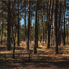 Серія "Паркові походеньки". Портрет лавки на тлі соснового бору